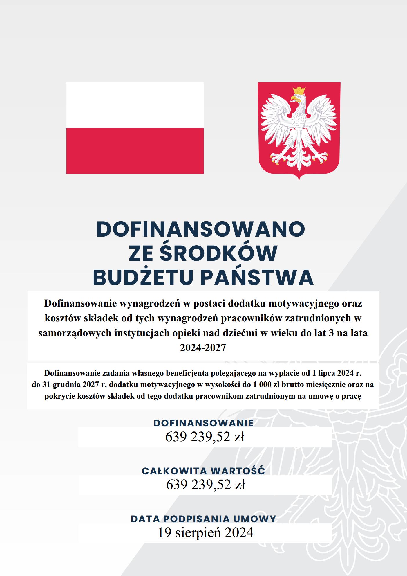 Nazwa zadania: Dofinansowanie zadania własnego beneficjenta polegającego na wypłacie od 1 lipca 2024 r. do 31 grudnia 2027 r. dodatku motywacyjnego w wysokości do 1 000 zł brutto miesięcznie oraz na pokrycie kosztów składek od tego dodatku pracownikom zatrudnionym na umowę o pracę.